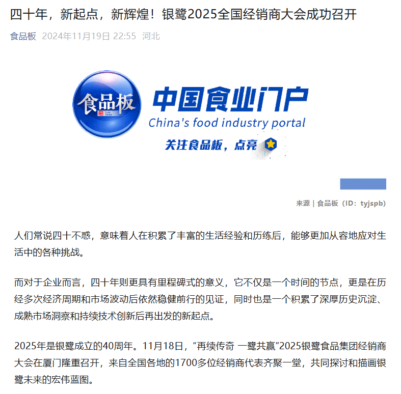 四十年,新起點(diǎn),新輝煌!銀鷺2025全國經(jīng)銷商大會(huì)成功召開(來源:食品板)發(fā)布日期:2024-11-26